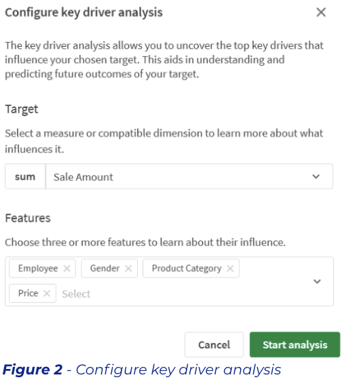 In the example of Figure 2, I want to see factors (features/dimensions) affect sales, and so I chose SUM(Sale Amount) as the measure and Employee, Gender (customer), Product Category, and Price to see how these affect sales.