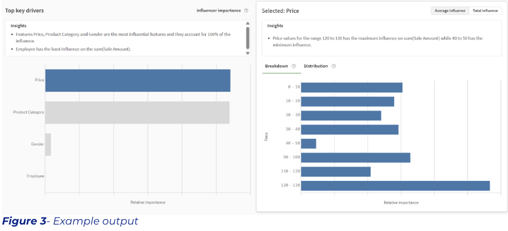 Influence is derived by “calculating the SHAP values for each feature data value in the subset of data you are analyzing”. SHAP (Shapley Additive exPlanations) is a machine learning technique that Qlik uses for key driver analysis. Key Driver Analysis also provides some helpful textual narrative insights