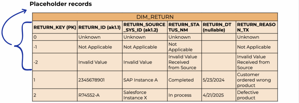 Now, when users submit a query that needs to return a value(s) from the dim – e.g., they want to get a count of returns by RETURN_STATUS_NM – they would be able to quickly see how many returns have a value of Unknown or Invalid Value. They could then investigate in the source system as to why there are returns without a return id or returns with an invalid value, so they could correct them. These placeholders can also be used for data quality reporting in order to be proactive, or could even be used as a constraint in the fact table. For example, if the business determines that there should NEVER be a fact record loaded where the RETURN_KEY is 0 or -2, then a database constraint can be placed on RETURN_KEY in the fact table, which would cause a constraint violation and halt the load when a 0 or -2 is attempted to be inserted into the fact table.