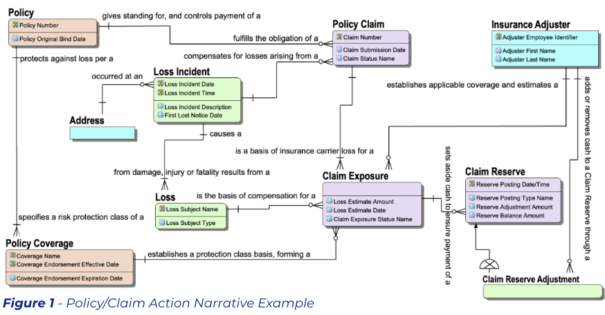 A robust relationship action narrative is the key component of overall model development, ensuring the entirety of the data’s functional context is modeled. By explaining the action of one entity’s function to another, the involvement of other functions not yet modeled is often exposed. In our example, the Adjuster’s action narrative with Claim Exposure identifies the need for Coverage to establish a basis for the Claim Exposure. The Policy Coverage relationship provides this support.